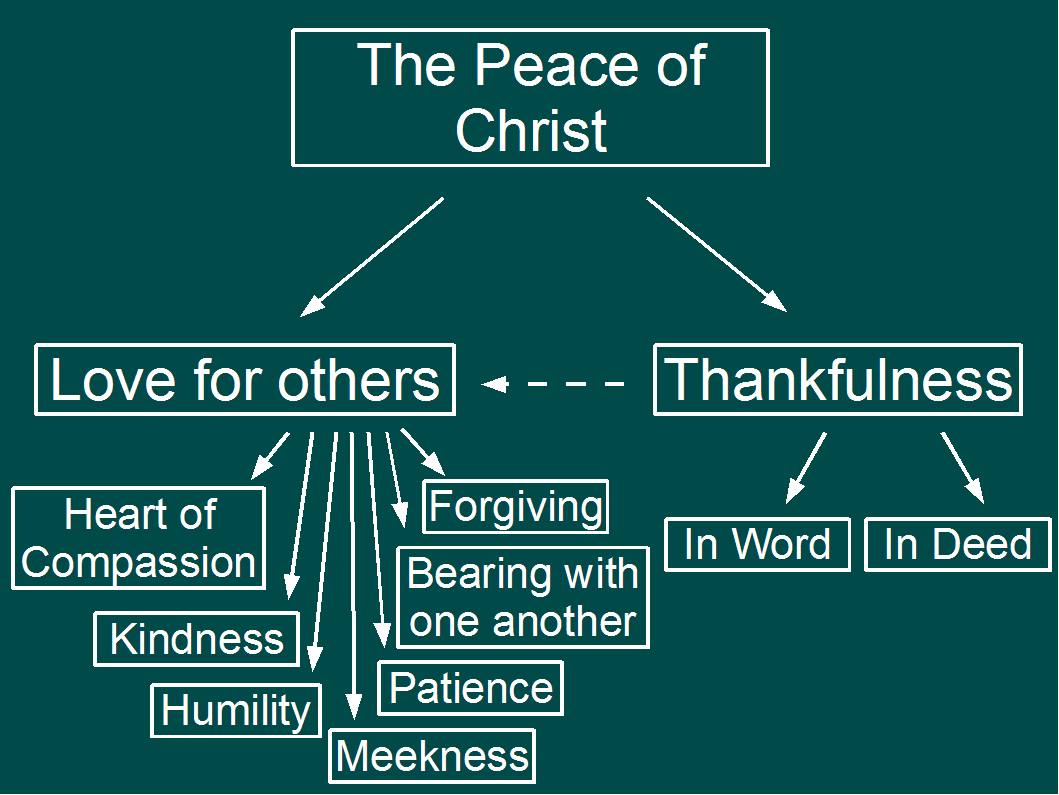 The peace of Christ is kind of the top heading (v. 15). We have a judicial peace with God. We have a relational peace with God, which causes us to also have a peace in life. We ought to always have this subjective peace, but sin gets in the way. Letting the peace of Christ rule your heart means to always remember what Christ has done for you, giving you this peace with God. This peace causes us to have love for people and thankfulness toward God.