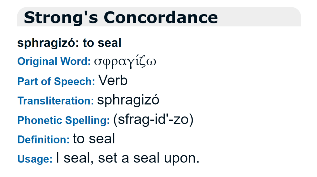 The Greek word ???????? means “to set a seal upon.” It’s what a king did with his signet ring to show that a letter he wrote was authentic. So when God set His seal on us, He was not only assuring us of the blessings that we have in Christ, but He was swearing by His own name that it was true. In other words, because God is true, and God doesn’t lie, we can be confident that we are truly blessed in Christ, because He set His seal upon us, which cannot be revoked.